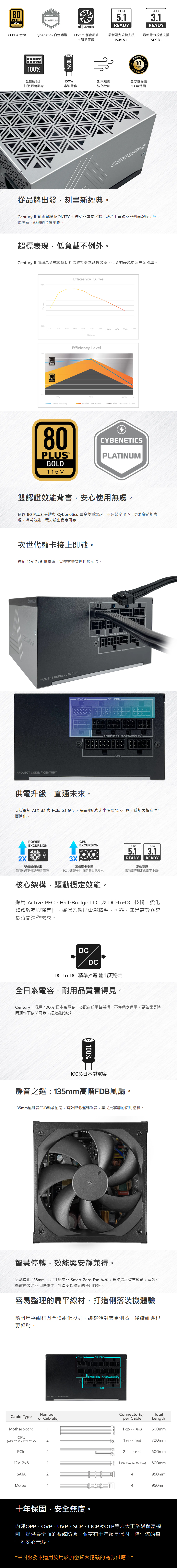Montech CENTURY II 850W 雙8/金牌/全模/ATX3.1(PCIe 5.1)/全日系/10年